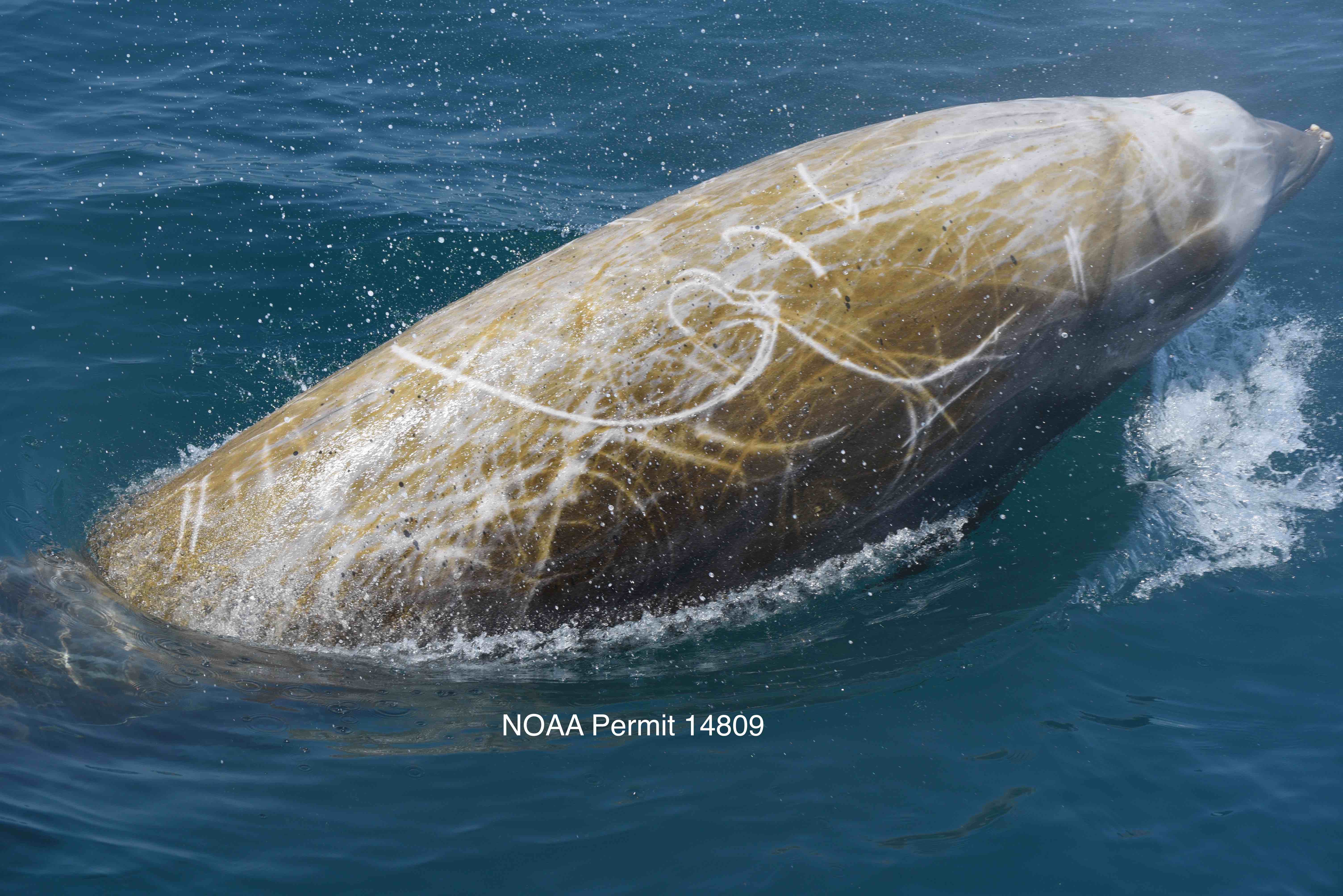Adult male Ziphius off Cape Hatteras. Note the erupted teeth on the distal portion of the lower rostrum. Photo credit - Heather Foley.