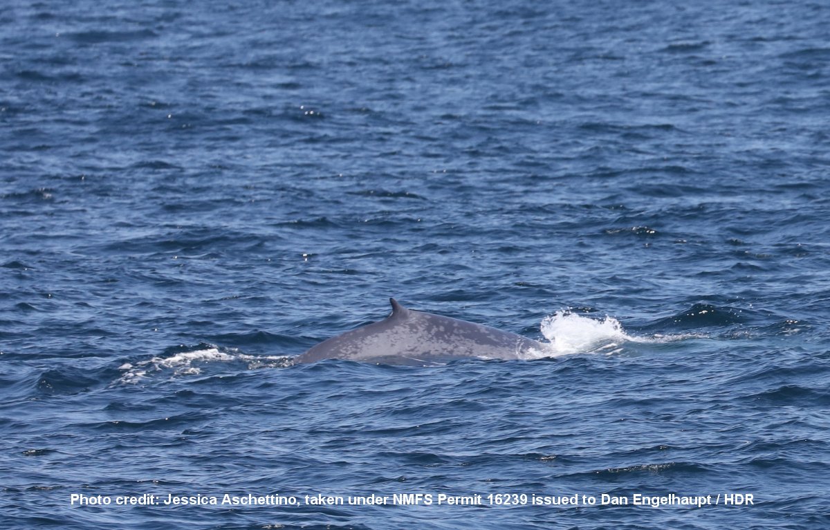 On April 11 HDR ran a boat-based visual survey as part of the Mid-Atlantic Outer Continental Shelf Break Cetacean Study in addition to the aerial survey. The vessel crew's first sighting was a humpback whale, but soon they received a call that the aerial team had again located right whales. The boat headed to that area and had 12 sightings of 5 species – including three right whales (one of which was a resighting from the previous day). A fecal sample was collected from the right whales, which will be sent to other researchers for analysis. Other species sighted included five endangered fin whales, three more humpback whales, and common dolphins. However, perhaps just as notable as the right whale sightings was a sighting of a juvenile blue whale. This blue whale sighting may be the first photographic record of this species in the area, with only sightings known from further offshore as part of NOAA’s AMAPPS surveys and an offshore tag track from an individual tagged off Canada. The Aerial team also had a sighting of an endangered sei whale.
