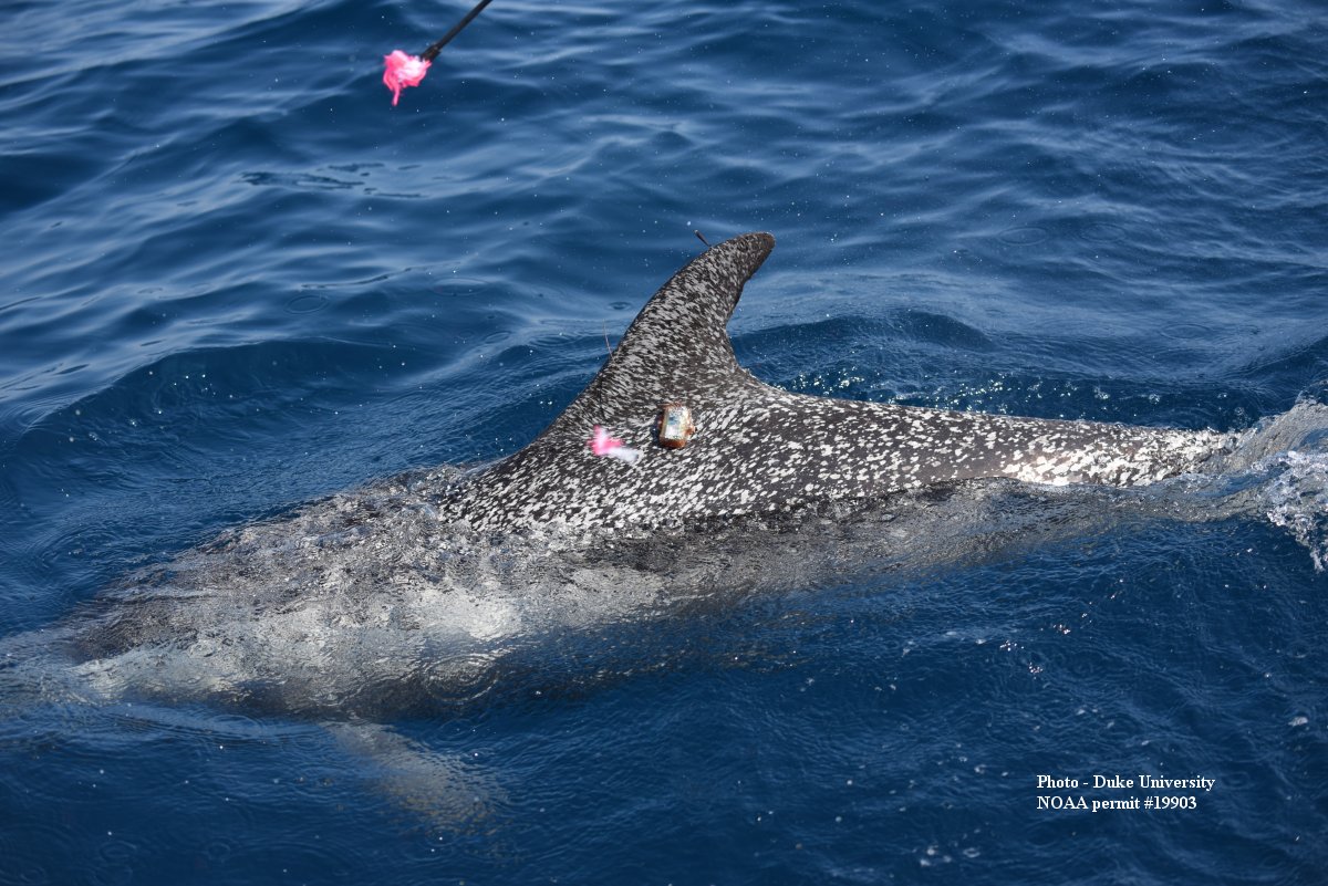 The crew was rewarded for the long offshore trips, with sightings of short-finned pilot whales, a species only seen twice during vessel surveys since the project began in JAX in 2009, and successfully deployed four tags on them. It will be fascinating to see where these animals travel. Interestingly, none of the 40 short-finned pilot whales tagged off Cape Hatteras have traveled further south than Onslow Bay, NC. Additionally, last year, several photo-identification matches were made between pilot whales at this JAX site and a catalog maintained by the Bahamas Marine Mammal Research Organization, run by Diane Claridge, so it’s possible these animals are part of a completely separate population than the NC animals. Stay tuned to see if these tagged animals head to the islands!