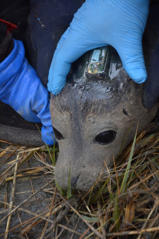 The satellite telemetry tags used during this study will transmit data on the location of the seal until it falls off during the summer molt. NMFS-NEFSC Permit No. 17670-04. Photo credit - Deanna Rees, NAVFAC Atlantic