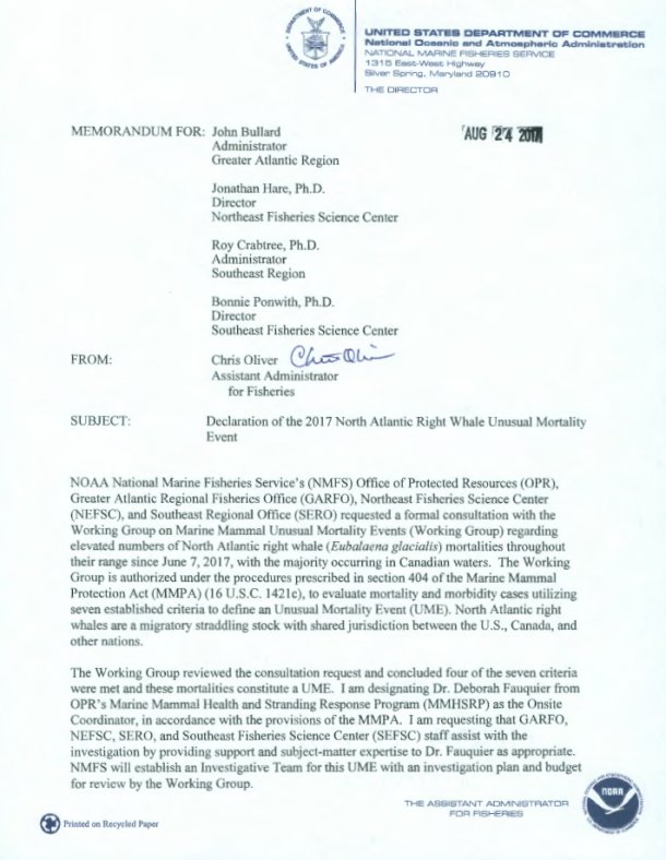 NOAA Fisheries has declared an Unusual Mortality Event (UME) for North Atlantic right whales throughout their range based on recent elevated strandings along the Atlantic coast, predominantly in the Gulf of St. Lawrence region in Canada. This event began in June 2017 and strandings remain high, with the most recent stranding occurring offshore of Cape Cod, Massachusetts on August 14, 2017.