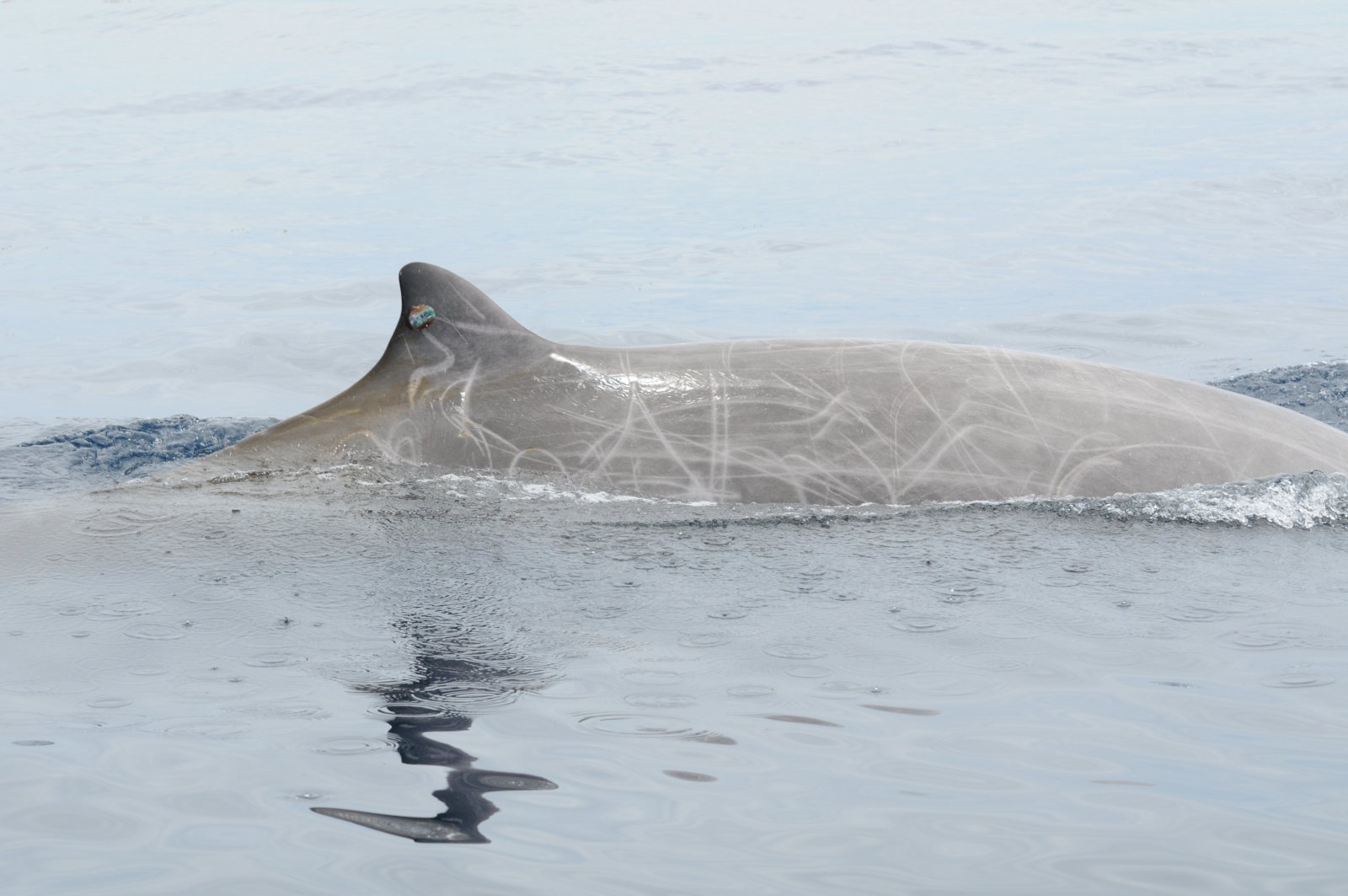Male Cuvier's beaked whale (ZcTag055) equipped with a satellite-linked dive recorder off Cape Hatteras on 10 May 2017. NOAA Permit 14809.