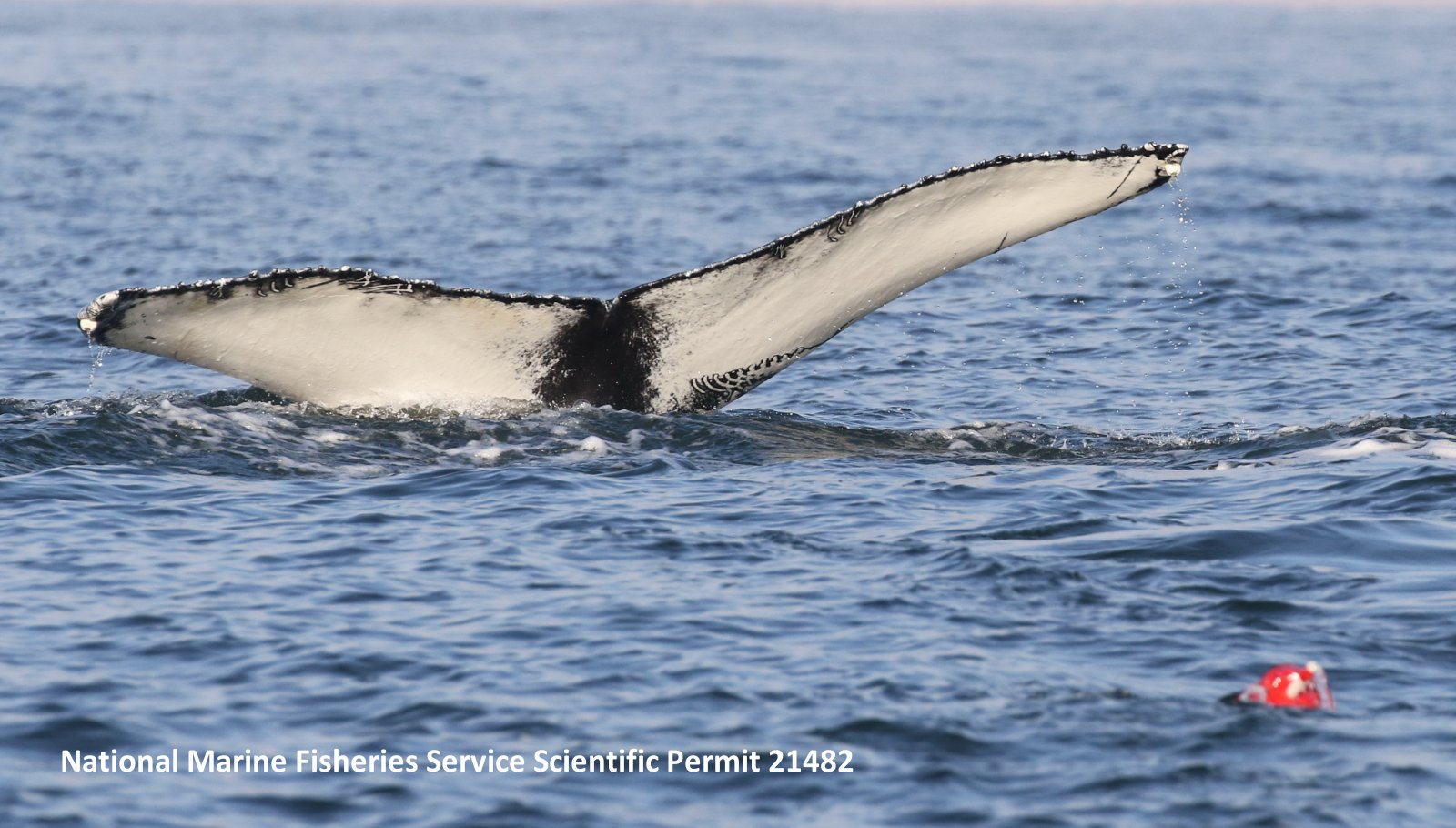 Tail fluke of the humpback as it goes down for a dive. The red buoy in the foreground is attached to the whale by a long piece of line likely entangled around one of the whale's pectoral fins