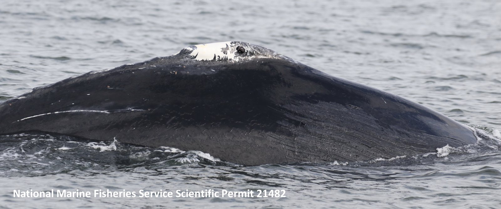 The telemetry tag can be seen on the whales' dorsal fin. The fin had been damaged at some point about a year ago but looks to be completely healed.