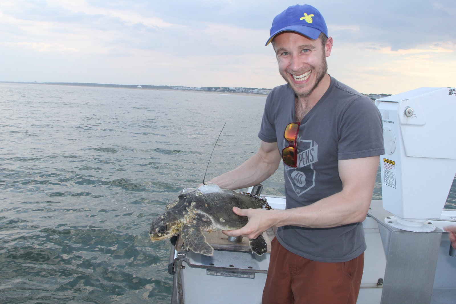 Andrew DiMatteo prepares to release a Kemp's ridley outfitted with a solar powered Argos tracking tag