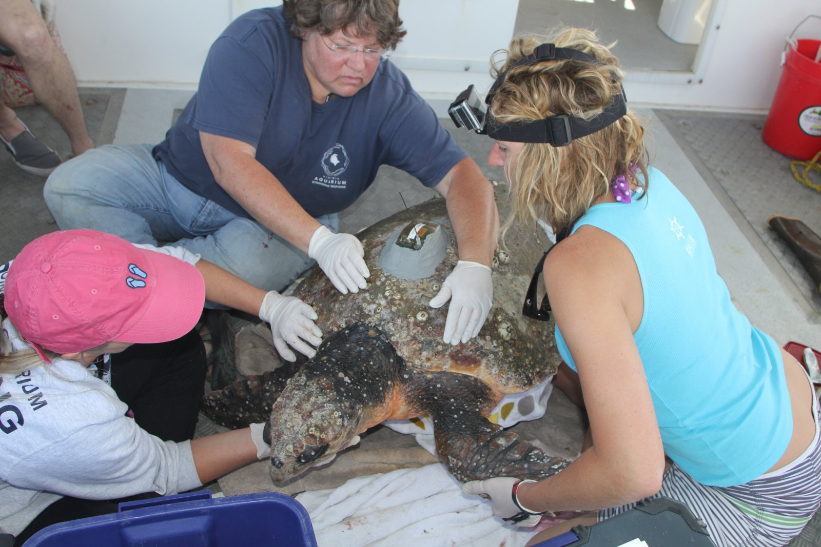 VAQ staff attach a satellite transmitter tracking tag to a loggerhead