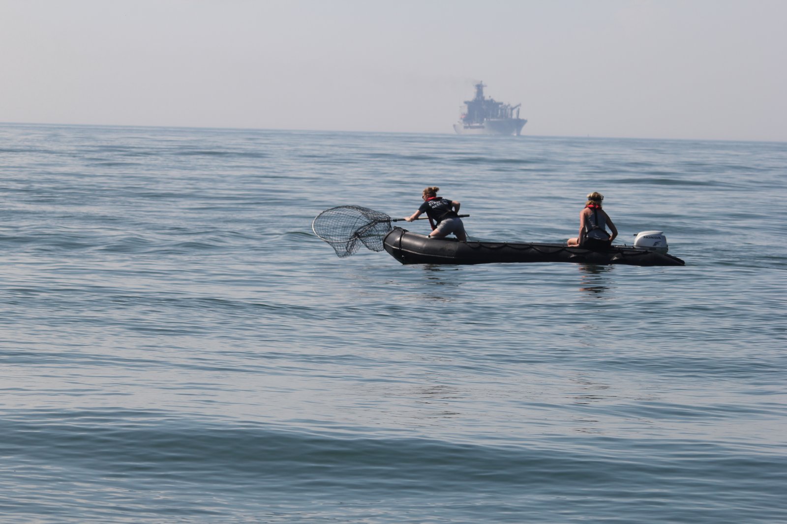 The success continued on Monday, May 18th when, after a slow morning and early afternoon only sighting a few turtles that quickly dove beneath the surface, the team sighted and captured a Kemp’s ridley sea turtle on the way back to port. Halfway through the health assessment for that turtle, the captain and mate spotted another Kemp’s ridley. Sue Barco, the Principle Investigator on the project, quickly decided to send a team after the second turtle and a capture was successfully made after a quick scramble by Andrew DiMatteo of NAVFAC LANT and Sarah Mallette of VAQ.