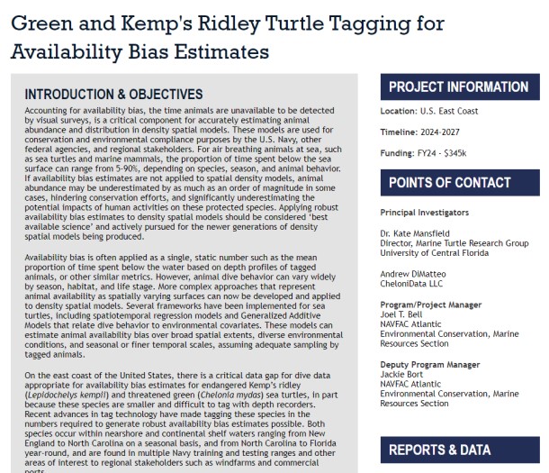 We are excited to initiate a new 4-year project working with Dr. Kate Mansfield from the Marine Turtle Research Group at UCF, and Andrew DiMatteo from CheloniData LLC. This project will be tagging Kemp's ridley and green sea turtles in the Atlantic over the next few years to collect telemetry and dive behavior data that will improve our spatial density models as well general understanding of their behavioral ecology. They will begin tagging very soon and we expect to have a blog post up once they are under way.