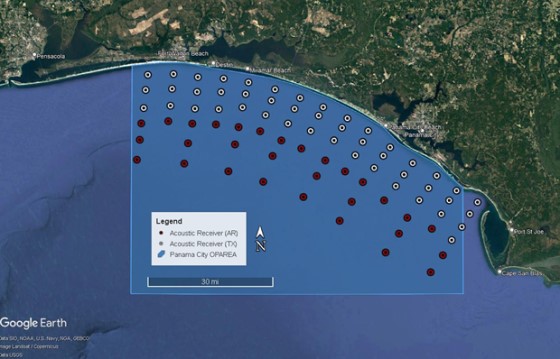 Figure 2. Overview of NAVSEA Gulf of Mexico testing area and NSWC Panama City Division Testing Range Operations Area with the year two passive acoustic receiver array (VEMCO VR2TX and VR2AR).